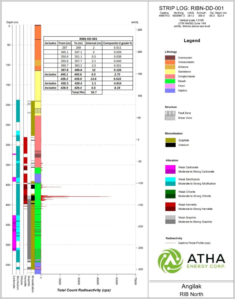Vancouver, British Columbia, November 20th, 2025 – ATHA Energy Corp. (TSX.V: SASK) (FRA: X5U) (OTCQB: SASKF) (“ATHA” or the “Company”), is pleased to announce assay results from the maiden drillhole at the RIB North Discovery, completed as part of the 2025 Angilak Exploration Program at its 100%-owned Angilak Uranium Project in Nunavut, Canada. Assay results from RIBN-DD-001 represent the best exploration hole to date at the Angilak Project, intersecting a total of 34.7 m of composite uranium mineralization1 over seven zones, from 287 m to 439.9 m depth. The highest grade and widest continuous interval of mineralization was intersected from 426.3 to 439.9 m depth, grading 0.53% U3O8 including 8.16% U3O8 over 0.5 m (Figure 4).