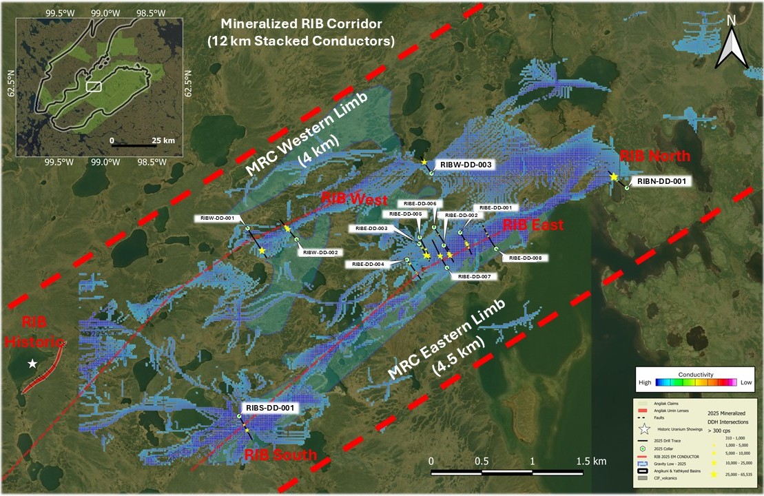 - RIB North Discovery is situated along the 4.4 km eastern limb of the Mineralized RIB Corridor (“MRC”) – a 12 km trend containing stacked structural anomalies, identified using 3D EM Inversion modeling. During the 2025 Angilak Exploration Program these anomalies were drill tested, resulting in a 100% success rate of intersecting uranium mineralization, and the discovery of four new mineralized areas: RIB East, West, North and South (Figures 2 & 3);