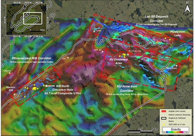 - Mineralized RIB Corridor: Located within the western edge of the Angikuni Basin, currently defined as 18 km long, where mineralization has been identified from the Historic RIB showing3 in the south through to an additional four showings discovered during the 2025 Angilak Exploration Program, including RIB North Discovery, where the maiden drillhole, RIBN-DD-001, returned assays with 34.7 m of total composite uranium mineralization1, including 13.6 m grading 0.53% U₃O₈, 1.1 m grading 4.81% U₃O₈, and grades up to 8.16% U₃O₈ over 0.5 m.