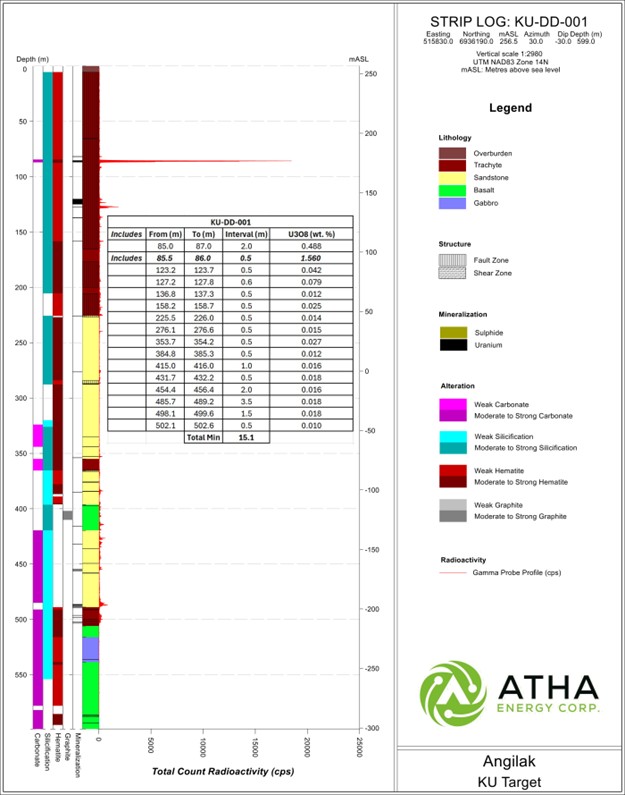 Detailed lithologic striplogs, including assay results tables, for all nine drillholes can viewed in the Supplementary Release on ATHA Energy’s website (Striplog Data).